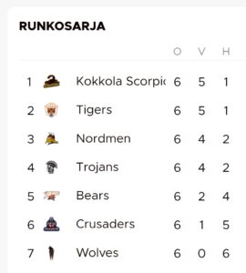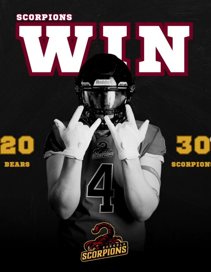 Viimeiset peliminuutit Scorpions kulutti kelloa victory formation- muodostelmassa jälleen kerran ja siten ei päästänyt vastustajaa enää pallolle. Siten voitto Kokkolan Scorpionsille lukemin 20-30.